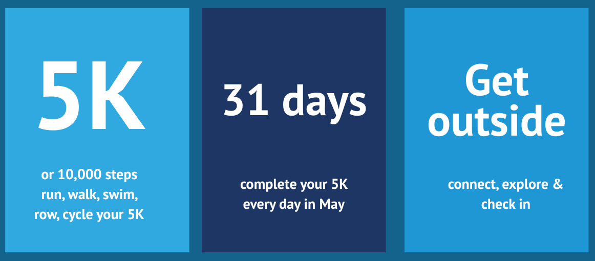 Get outside every day in May and cover 5K or 10,000 steps — whichever works for you. Walk it, jog it, cycle it, run it. The movement is the starting point; what you do with that time is up to you.